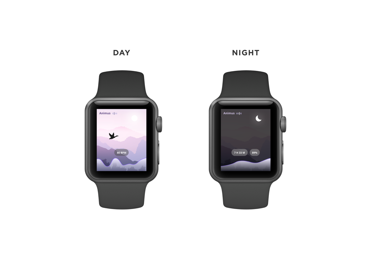At the heart of Animus is a visual language that transforms mental health data into a single, dynamic scene—one that speaks to users on an emotional level rather than through numbers. Rather than portraying group behaviors (like a flock of birds), I refined the prototype to feature a lone animal—giving each visualization more singular focus and reinforcing the sense of personal reflection. In this system, natural elements serve as metaphors for well-being: the sky’s brightness shifts with sleep quality; the terrain’s smoothness or jaggedness mirrors emotional stability; weather patterns reflect stress levels; vegetation density hints at nutritional health; and the presence of wildlife signals activity levels. By weaving these elements together into one cohesive tableau, Animus offers an ambient, intuitive portrait of daily well-being that users can immediately connect with.