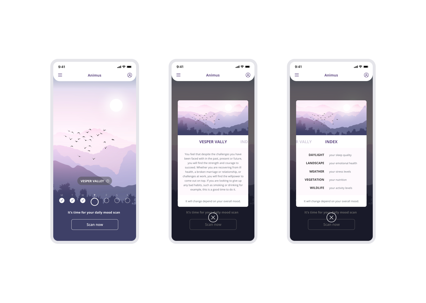 Animus, as a conceptual prototype, demonstrated the potential of using symbolic, ambient visuals to foster a gentler and more emotionally engaging approach to mental health tracking. Testing participants described the experience as calming and reflective, with one sharing: