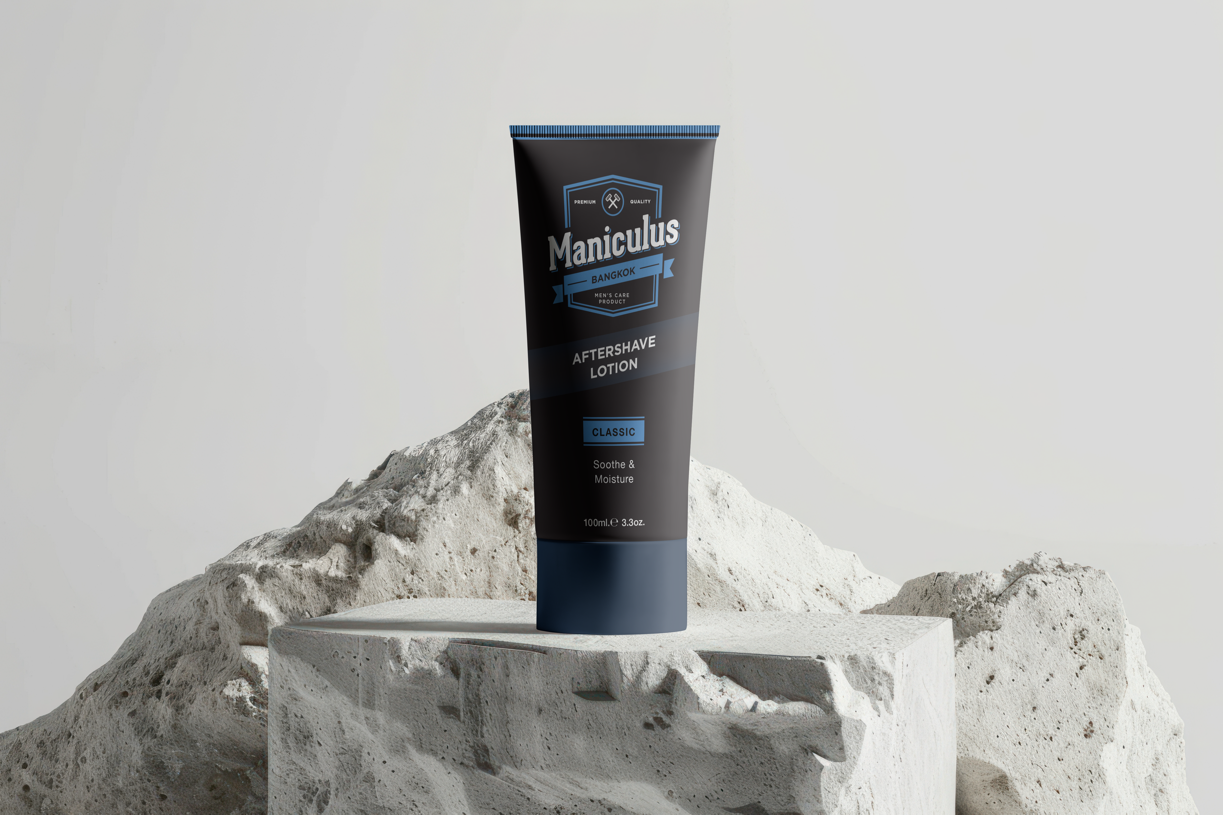 A bold, heritage-inspired identity for a Bangkok-based men’s care line. The custom emblem combines classic serif lettering with an old-school badge and crossed razors, evoking both craftsmanship and confidence. Applied across packaging and product variants—from Classic to Peppermint—the system adapts seamlessly through color-coded banners and label treatments, ensuring a cohesive yet flexible brand presence.