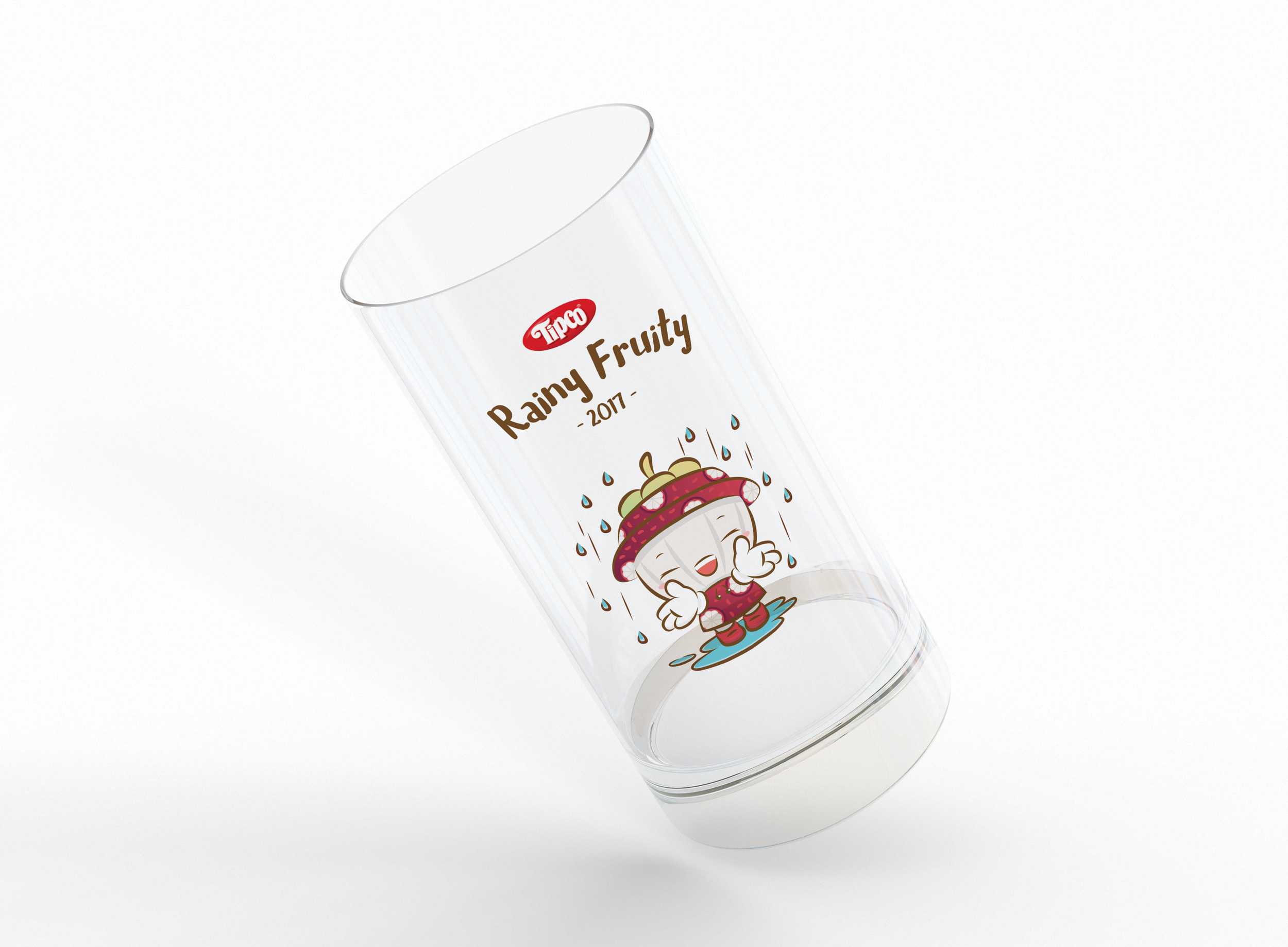 A whimsical cast of fruit-characters—each donning rain-ready attire—brings Tipco’s flavors to life across glassware. Hand-drawn line work and a limited, vibrant palette translate flawlessly to screen-printing on drinking glasses, turning every sip into a playful, rainy-day moment.